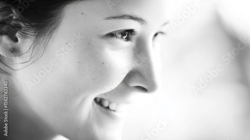 Elegant black-and-white close-up portrait of a woman with expressive eyes, gentle smile, delicate earring, and softly blurred background highlighting her features.