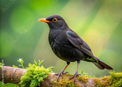 Elegant Blackbird Perched on a Branch Against a Soft Green Background in Natural Habitat Setting