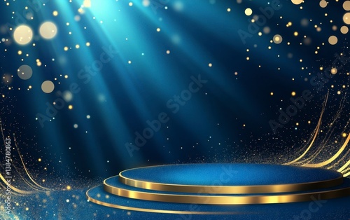 Elegant Blue and Gold Stage with Lights for Product Presentation