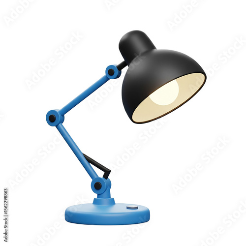 Elegant blue desk lamp with adjustable arm with yellow bulbe on white background