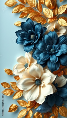 Elegant Blue White Flowers Gold Leaves Arrangement