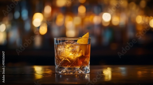 Elegant Bourbon Cocktail with Large Ice Cube in Moody Bar Setting