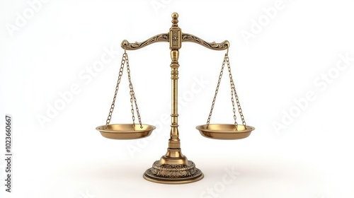 Elegant brass scales of justice in perfect equilibrium, isolated on a white background, representing fairness. No people.