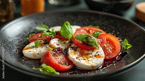 Elegant caprese salad: vibrant red tomatoes, creamy mozzarella, and fragrant basil arranged on a sleek black plate