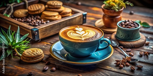 Elegant Capuchino on a Rustic Table Surface, Perfectly Frothy and Inviting, Ideal for Coffee Lovers and Aesthetic Enthusiasts, Capturing Cozy Café Moments with High Depth of Field