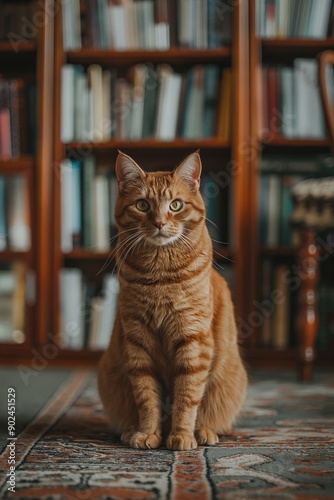 Elegant Cat Sitting in Home Library – Intelligence and Serenity Concept
