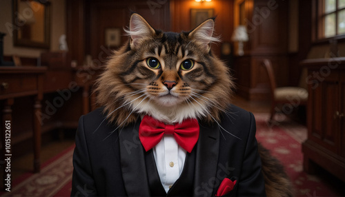 Elegant Cat Sophisticatedly Posed in Tuxedo and Bow Tie Against Luxurious Background