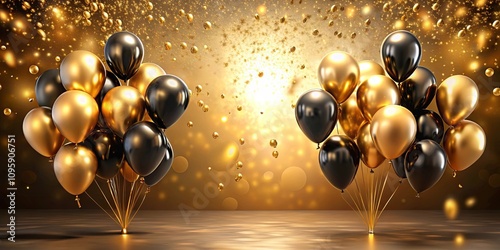 Elegant Celebration Two Bountiful Clusters of Gold and Black Balloons Against a Shimmering Background