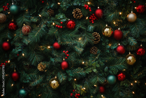 Elegant Christmas Pine Branches with Red Green and Gold Ornaments Holiday Lights and Seasonal Festive Background