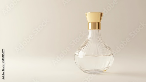 Elegant clear glass perfume bottle with gold cap, clear texture, white inner wall, solid color background