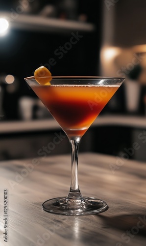 Elegant cocktail served in a stylish glass on a wooden bar countertop. Generative AI