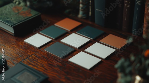 Elegant color palette tiles on wooden desk with books, creating a sophisticated interior design