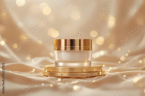 Elegant container shimmering golden cosmetic concept mockup with soft satin