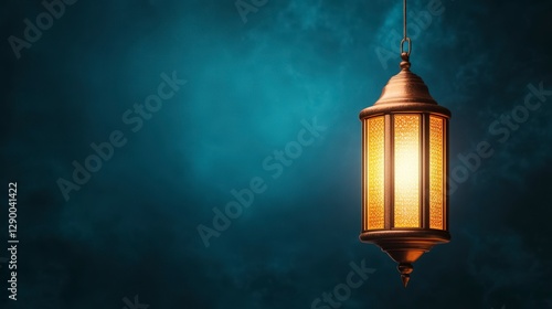 Elegant Copper Lantern Illuminating Dark Blue Background with Soft Glow Effect