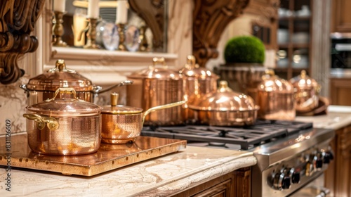 Elegant copper pots and pans displayed in a gourmet kitchen, with marble countertops and high-end appliances, showcasing luxury and sophistication