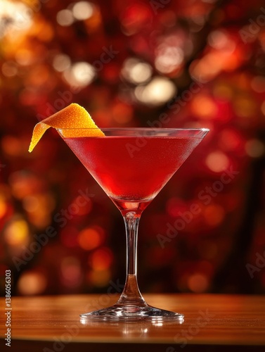 Elegant cosmopolitan cocktail in martini glass with orange zest garnish against festive bokeh background creating a sophisticated and inviting atmosphere