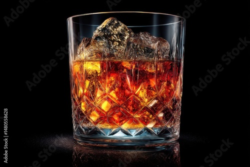 Elegant crystal glass of amber whiskey on the rocks, showcasing a textured glass and ice, set against a sleek black background, creating a high-contrast effect.