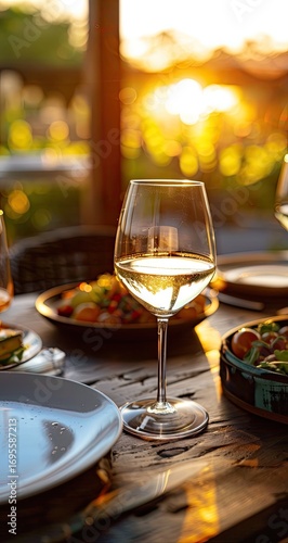 Elegant dining setup at sunset with wine glass and vibrant salads in the background