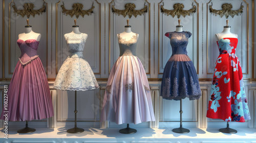 Elegant dresses displayed on mannequins in a sophisticated setting, showcasing fashion design creativity and style