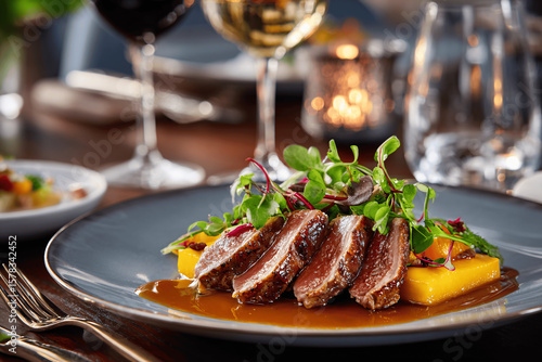 Elegant duck à l’orange with orange glaze on luxury fine dining table, gourmet style