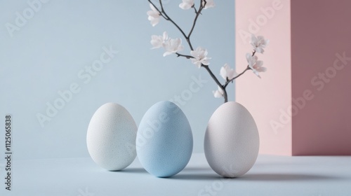 Elegant Easter Eggs Arrangement with Blossom Branch on Pastel Background