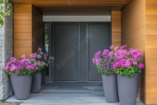 Elegant entrance with modern doors and vibrant pink flowers in stylish planters, creating a welcoming atmosphere in a contemporary home