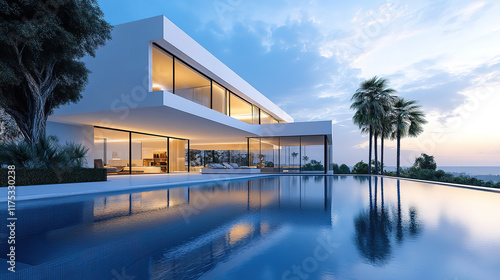 Elegant Exterior of Modern Cubic Villa with Expansive Swimming Pool and Palm Trees