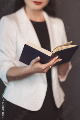 Elegant figure in a white blazer engaged in deep thought while holding an open book, illuminated softly by ambient light