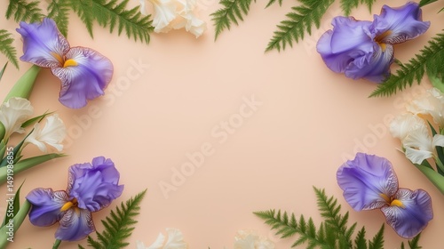 Elegant Floral Frame with Irises and Ferns on Pale Peach Background, Perfect for Invitations and Greetings