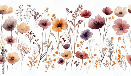 Elegant Floral Pattern with Vibrant Watercolor Blooms and Botanical Elements