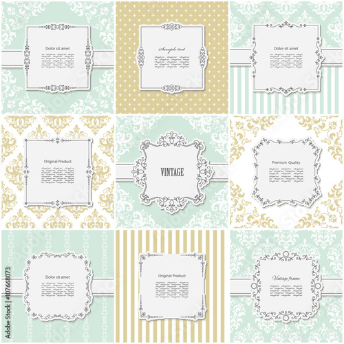 Elegant frame on pattern set in golden and blue trendy colors. Templates for wedding or scrapbook design.