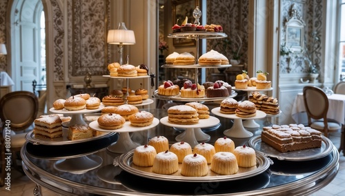 Elegant French patisserie with assorted pastries and cakes displayed in a luxurious Parisian cafe