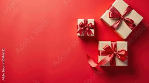 Elegant Gifts Wrapped in Beige Paper with Crimson Ribbons on a Vibrant Red Background