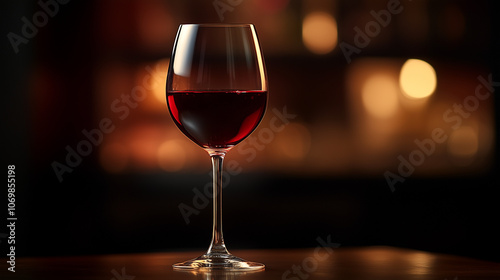 Elegant glass of red wine on a wooden table, soft bokeh lights, refined restaurant atmosphere, copy space