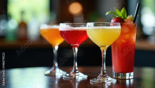 Elegant glassware with colorful cocktails on a table, table, fruit