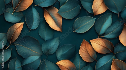 Elegant Gold and Teal Leaf Background, Elegant background with gold and teal leaves on a dark teal backdrop