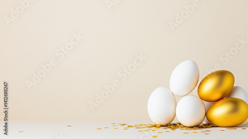 Elegant golden and white easter eggs display minimalist background festive decor close-up view