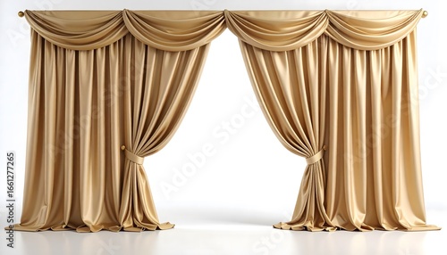 Elegant golden beige theater curtains with a swag valance, parted to reveal a white background. Realistic drapery mockup for interior design.