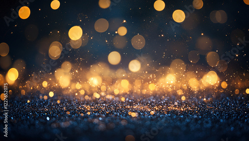 Elegant Golden Bokeh Lights on Dark Blue Background, Sophisticated Digital Design Atmosphere