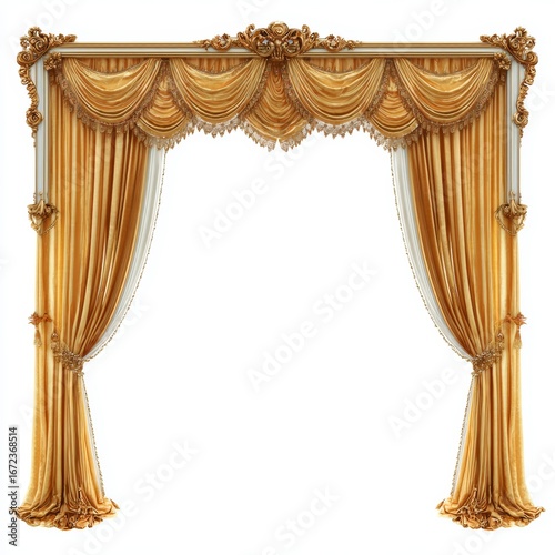 Elegant golden curtains with intricate design and ornate details, creating a luxurious atmosphere. The curtains showcase a refined style.