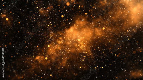 Elegant golden dust floating through the darkness of space with various small particles, Dramatic Orange and brown Dust Cloud with randomized floating particles, Golden Sand Explosion on Dark texture.