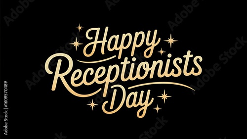 Elegant golden script typography celebrating happy receptionists day with sparkles and stars on a black background