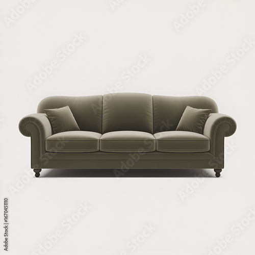 Elegant grey three-seater sofa with rolled arms and accent pillows couch seating