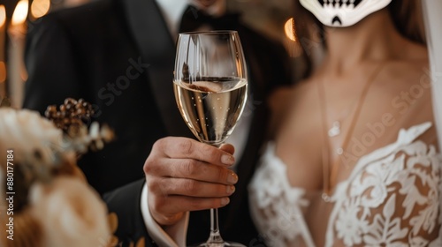 Elegant Halloween soiree, couple in stylish costumes, sophisticated decor with a hint of spooky elegance, an upscale and memorable evening