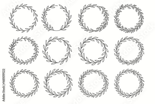Elegant hand-drawn laurel wreath designs in circular frames for decorative use