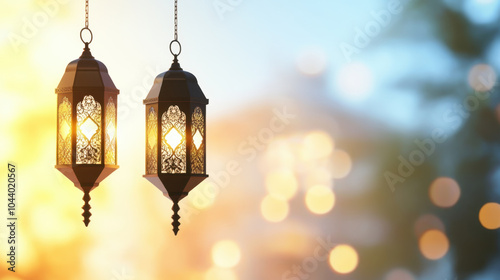Elegant hanging Islamic lanterns illuminate soft, blurred background, creating warm and inviting atmosphere. intricate designs of lanterns add touch of cultural beauty