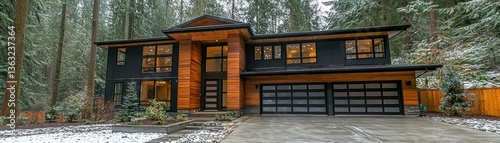 Elegant home in winter forest. Modern design set amidst snowy trees. Ideal real estate