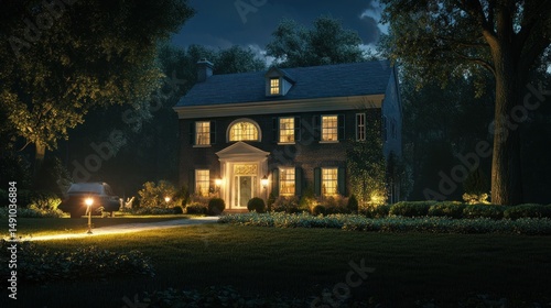 Elegant house in tranquil night setting with illuminating outdoor lights creating warmth