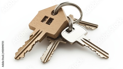 Elegant House Keys Arrangement with House-Shaped Keychain on Pure White Background