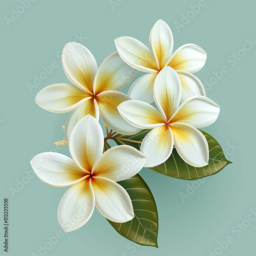 Elegant illustration of three plumeria flowers with vibrant colors and detailed leaves.